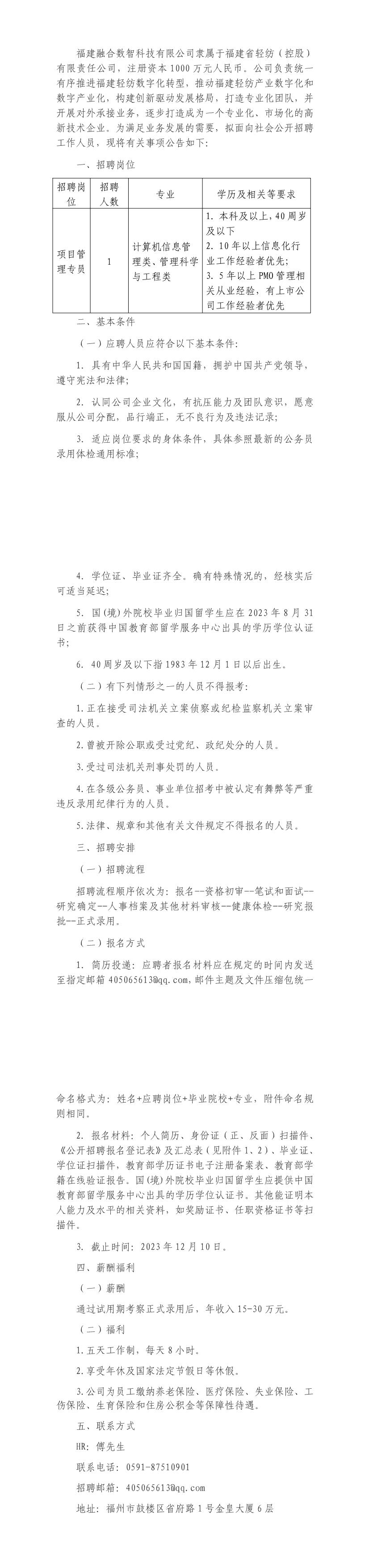 福建融合數(shù)智科技有限公司 2023年秋季招聘公告