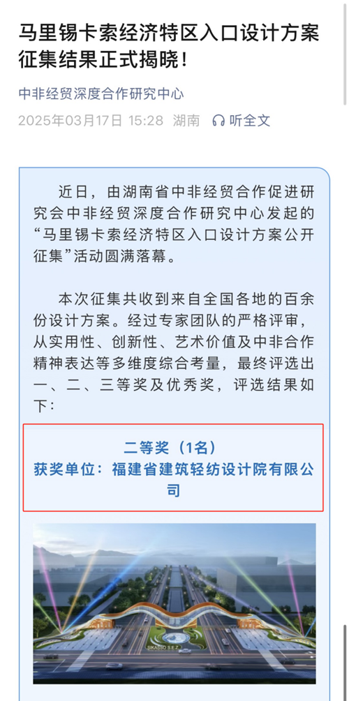 近日,由湖南省中非經(jīng)貿(mào)合作促進(jìn)研究會(huì)中非經(jīng)貿(mào)深度合作研究中心發(fā)起的“馬里錫卡索經(jīng)濟(jì)特區(qū)入口設(shè)計(jì)方案公開征集”活動(dòng)結(jié)果正式揭曉,福建省建筑輕紡設(shè)計(jì)院有限公司園林景觀一所從全國(guó)百余家參選單位中脫穎而出,憑借出色的設(shè)計(jì)方案斬獲競(jìng)賽二等獎(jiǎng)殊榮。
