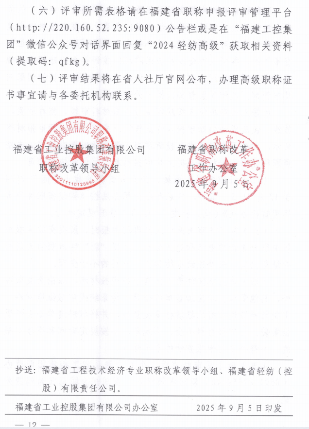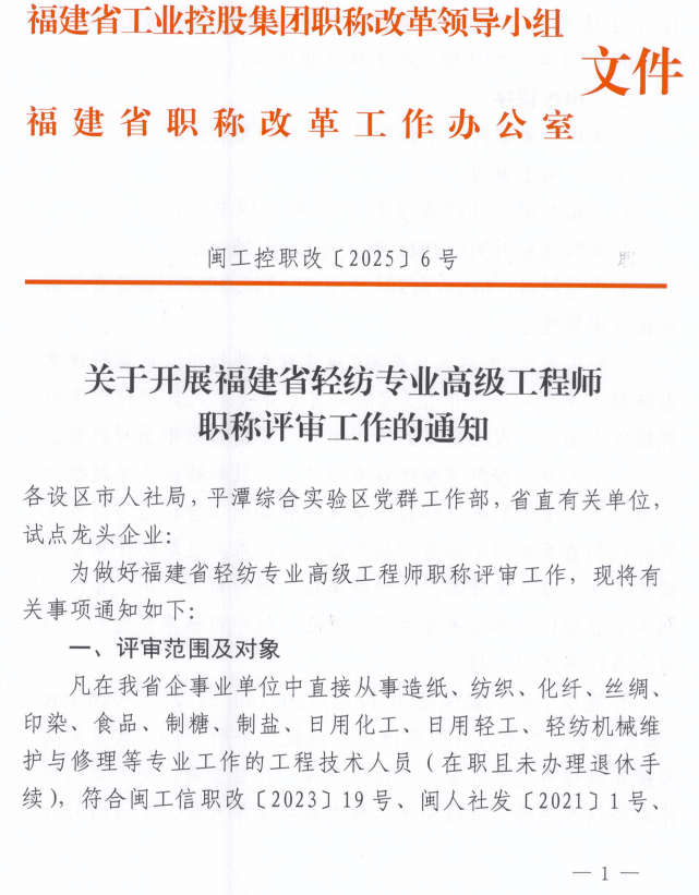 福建省工業(yè)控股集團(tuán)職稱改革領(lǐng)導(dǎo)小組福建省職稱改革工作辦公室文件-關(guān)于開展福建省輕紡專業(yè)高級工程師職稱評審工作的通知