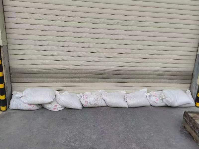 (7月28日臺(tái)風(fēng)“杜蘇芮”登陸后,晶海輕化車(chē)間包裝物倉(cāng)庫(kù)卷閘門(mén)滲水,搶險(xiǎn)黨員突擊隊(duì)隊(duì)員緊急堆疊沙袋堵漏,并轉(zhuǎn)移包裝物。)