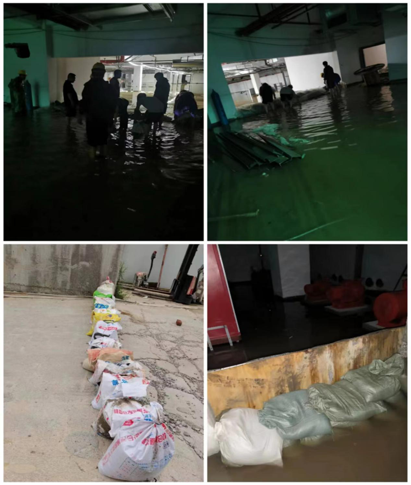 7月29日凌晨3:30,項目所在地再次下起了大暴雨,隨著降雨量加大,2#樓北側(cè)圍墻外內(nèi)河河水倒灌,項目工地積水水位不斷上漲,地下室集水坑臨時水泵由于出水口積水水位比出水口高,所以導致臨時水泵無效,險情再次出現(xiàn)。搶險突擊隊迅速在2#樓北側(cè)圍墻外內(nèi)河河水倒灌口處,筑高堤壩進行攔堵河水倒灌;加高圍堰,攔截雨水進入地下室;重新規(guī)劃抽水泵位置,將雨水排放到市政雨水井,防治雨水再次倒灌;在地下室生活泵房四周用沙袋筑起圍堰防止雨水流入,浸泡設備,并對地下室生活泵房集水坑臨時水泵進行疏通,降低泵房水位;在空調(diào)機房四周進行圍堵,減少雨水流入浸泡機房;增加兩臺5.5KW大功率水泵進行排水,降低機房水位。