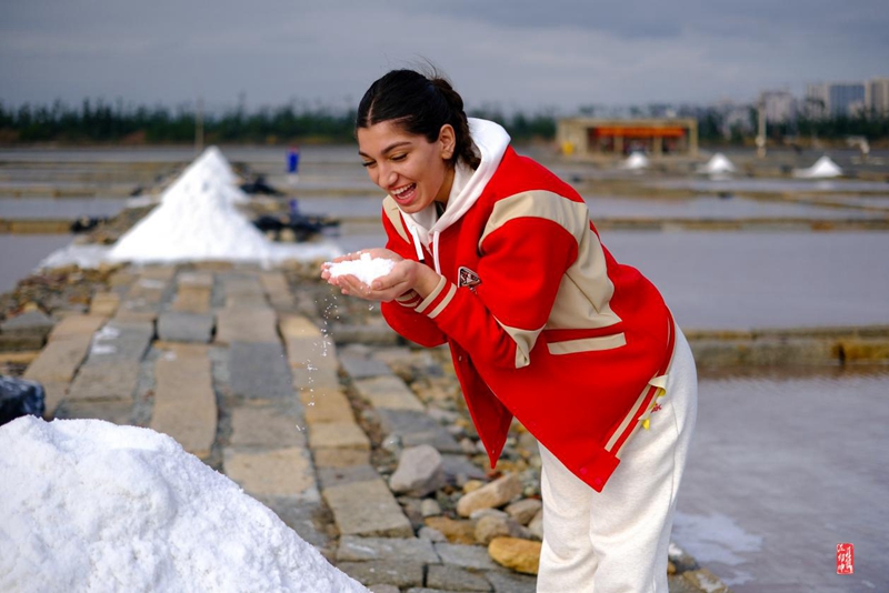 在聽完工作人員的介紹,得知山腰鹽場的海鹽傳統(tǒng)曬制技藝是第七批福建省非物質(zhì)文化遺產(chǎn)項目后,世界旅游小姐們不禁連連稱贊,好奇心頓增,手持鹽耙跟著鹽工師傅學(xué)習(xí)制鹽技術(shù),沉浸式體驗海鹽文化魅力,并自發(fā)化身為福鹽集團產(chǎn)品“推介官”,宣傳推廣“閩鹽”、“福鹽”等高端生態(tài)海鹽產(chǎn)品。