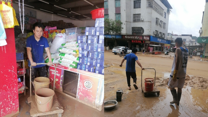 救災(zāi)現(xiàn)場,黨員們在積水中來回奔走,分工協(xié)作把貨物從倉庫搬往安全地帶,清理洪水過后的淤泥、積水、垃圾,并對店內(nèi)受淹區(qū)域進行消毒滅菌,最大程度幫助客戶減少損失。雖然每個人臉上都滿是汗水、身上滿是泥漿,但龍鹽人始終秉持點滴出發(fā)、服務(wù)客戶的理念和情懷,積極踐行著國企的責(zé)任與擔(dān)當(dāng)!